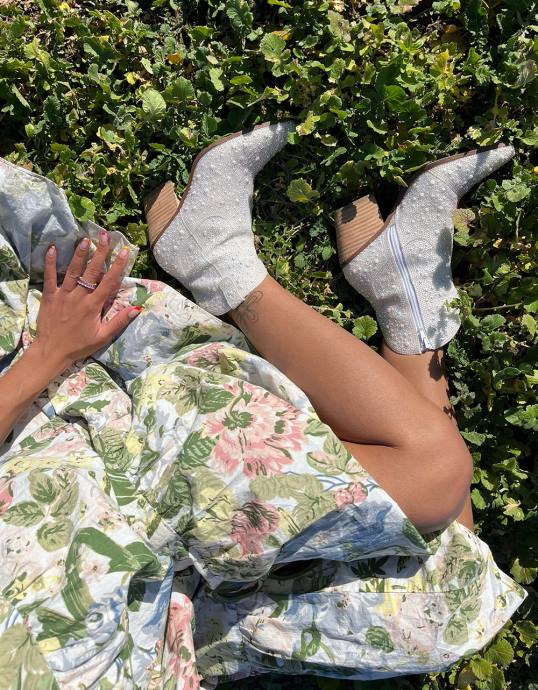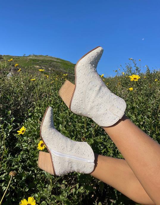Betreten Sie diese vom Western inspirierte Ära mit dem Selbstvertrauen einer Diva, geschmückt mit den glamourösen Allover-Western-Stiefeletten aus Perlen. Tanzen Sie zur Musik und bewegen Sie Ihre Füße im Takt während dieser Festival- Saison und zeigen Sie Ihren Stil mit diesen lustigen weißen Stiefeln.